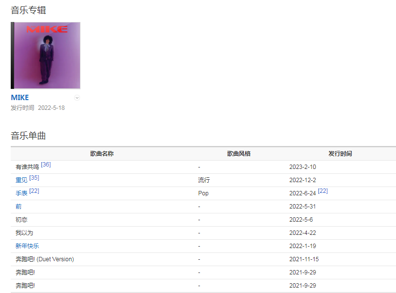 2022年1月,獲得2021年度叱咤樂壇流行榜頒獎典禮叱咤樂壇生力軍男歌手銅獎;4月,參加的音樂獻禮節(jié)目《聲生不息》在湖南衛(wèi)視播出 ,并憑借歌曲《初戀》最終拿下了首期節(jié)目的第1名,這也讓他被更多的內(nèi)地觀眾所認識;5月18日,推出首張個人音樂專輯《MIKE》 。