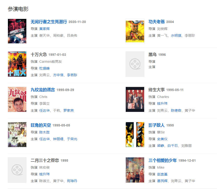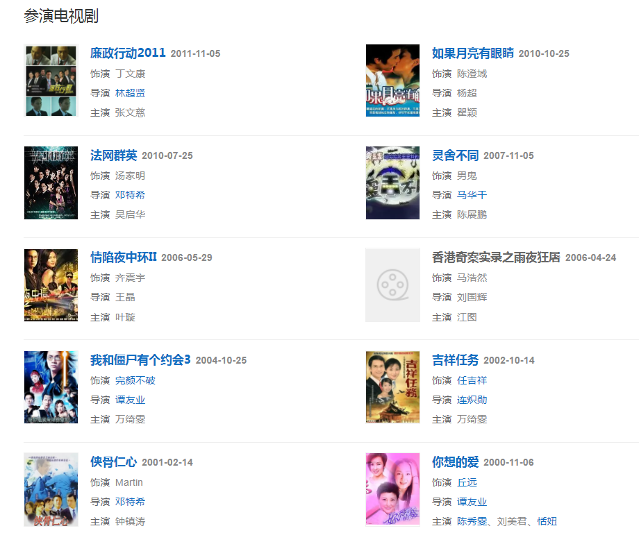 1998年至2004年出演《我和僵尸有個約會》系列劇3部而被中國內(nèi)地觀眾所知;