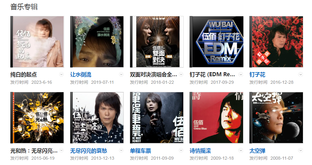 截至2020年,伍佰共發(fā)行28張個人專輯,臺灣區(qū)專輯總銷量累計超過500萬張。